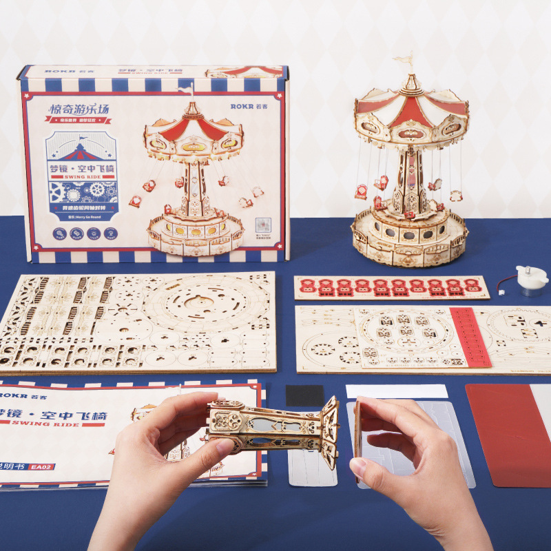 DIY music box is a creative and fun-to-play wooden 3D puzzle kit of Magic Amusement Park Series. Its design is inspired by the swing ride in the amusement park. With built-in movement, the seats will be suspended from the rotating top of the carousel with music and lights on by simply touching the button. Build this exquisite 3D wooden puzzle with your hands and enjoy the ride!