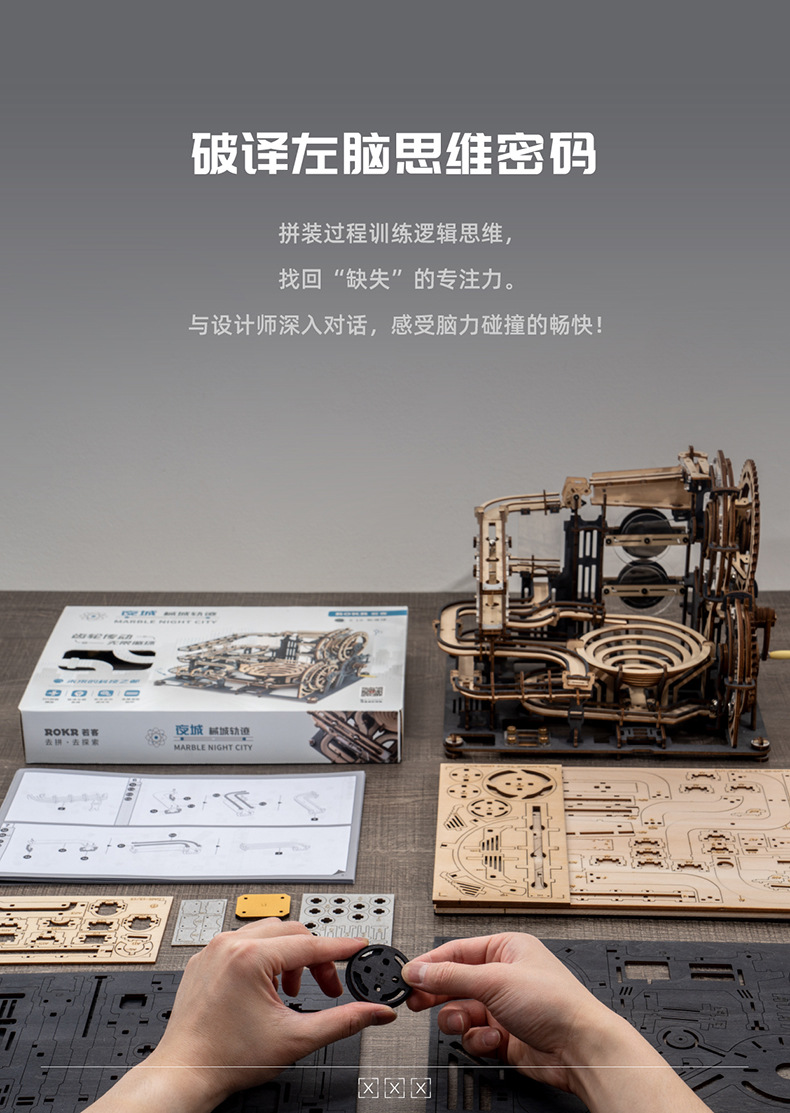 It is a self-assembly 3D wooden puzzle with Tower Distributors & track race balls. Build the set and crank the handle. Watch marbles run crazy down the slopes and twisting turns.