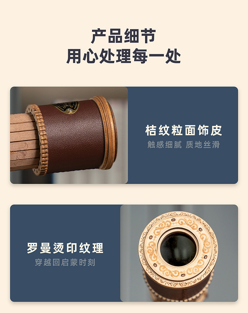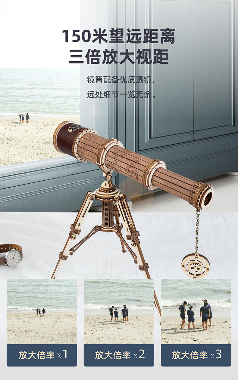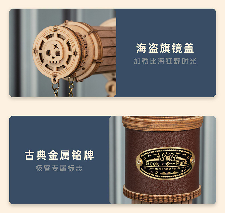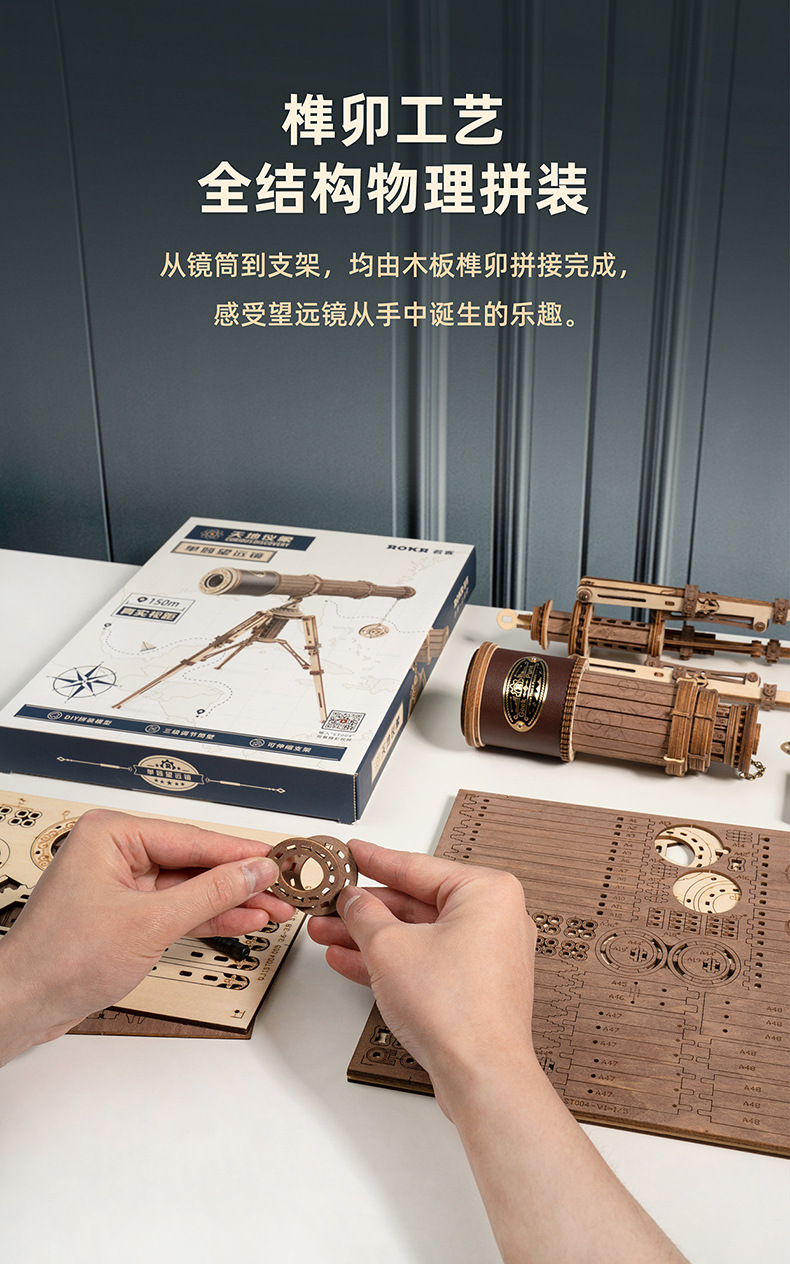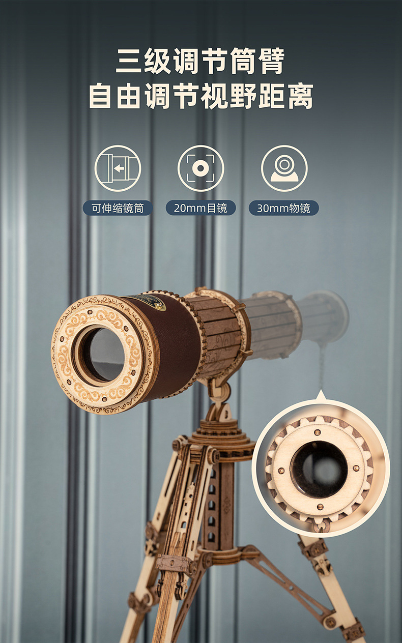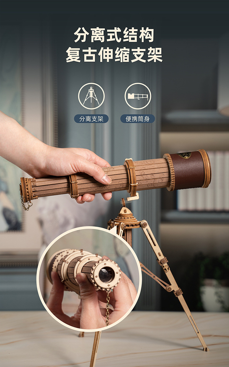 Monocular telescope ST004 is a classic-style telescope model 3D wooden puzzle. This ROKR puzzle is designed with decorative leather & retro metal nameplate, adjustable tripod, telescope lens barrel. The real sight distance is 150M (500ft). Building it with your own hands will be an experience for navigators and adventure lovers.